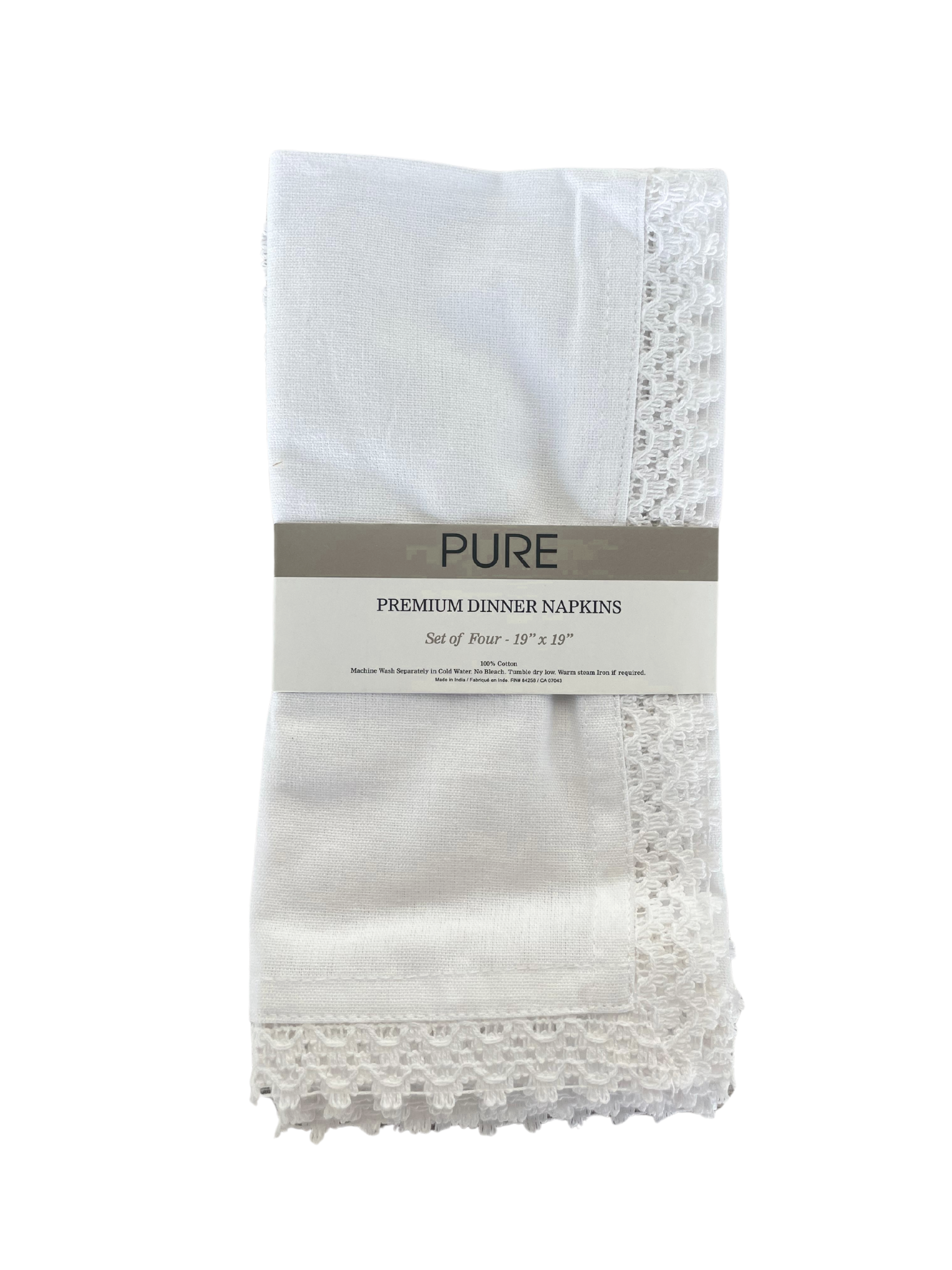 Set of 4 Premium Dinner Napkins by Pure These napkins are white with crochet detailing that add a beautiful design...