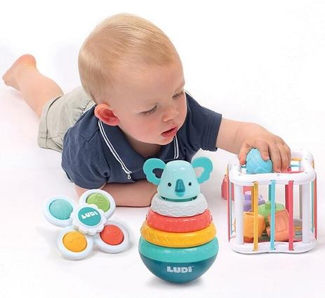 Manipulative games box. Discover this set which is made up of 3 Baby spinners, a pyramid stacking game (made up...