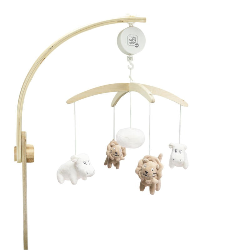 Musical mobile with wooden stand and wheel to attach to baby's crib bars. 5 soft toys are suspended and a...