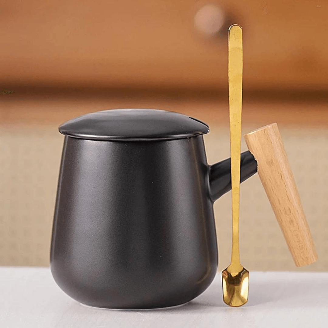 Wood Ceramic Mug with Simple Wooden Handle 390ml (Black Ceramic Cover Spoon)