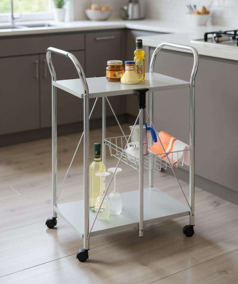 WENKO Rolling Cart Organizer Sunny, Foldable Rolling Utility Cart, Powder-Coated Metal, Rolling Kitchen Cart, Silver Chrome, Dimensions 56.5 × 90...