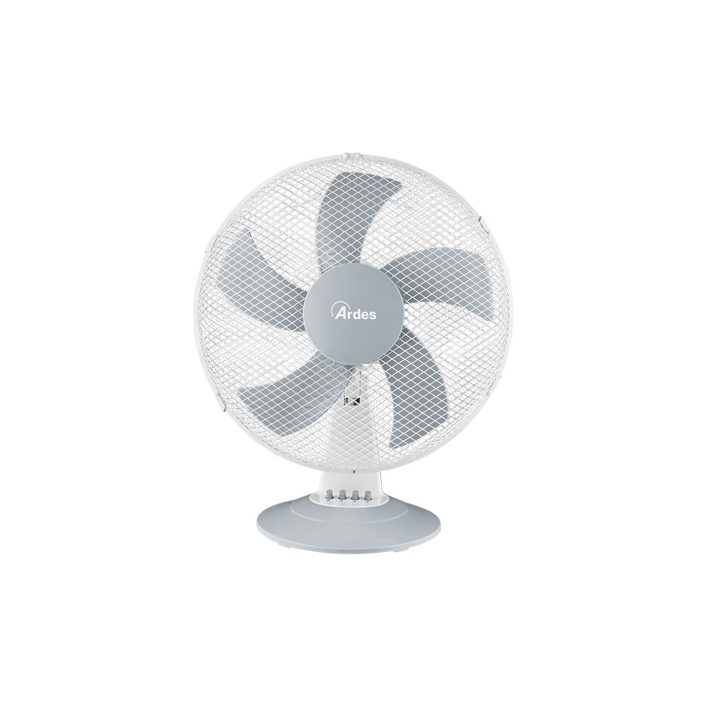 Desk fan 40 cm, 5 blades, mesh grid, 3 speeds, automatic side swing. Gray blades and details. Vertical tilt. Power...