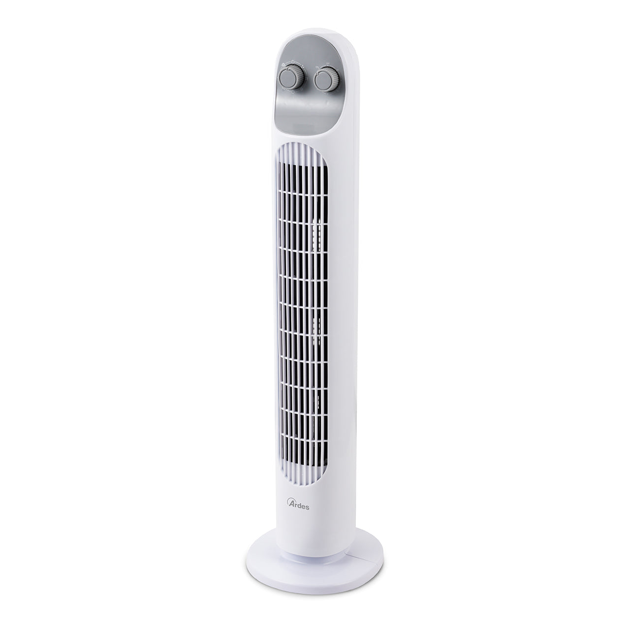 Tower fan with manual controls. 81 cm-height. 3 speeds. 120 min timer. Automatic side swing. White look. Cool your environment...