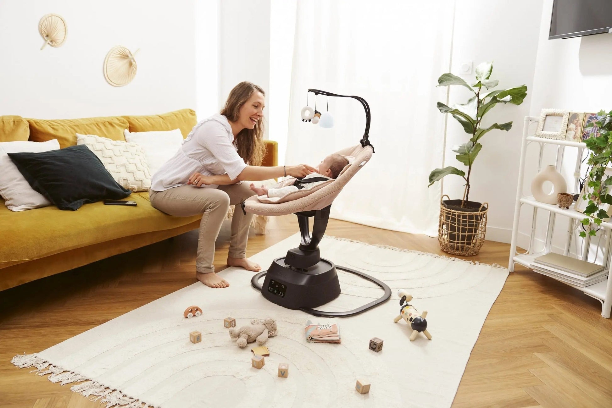 The user-friendly app enables intuitive operation. Simply select the type of movement and speed (5 different levels) on your smartphone and play it directly on the swing. All functions can be programmed via the app, including the swing time: 10, 20 or 30 minutes. The Babymoov Swoon Evolution Connect baby bouncer offers 8 gentle rocking movements that make your child feel as safe and secure as if they were in your arms. Thanks to the 360° swivelling seat, your baby is always in the middle of the action without you having to carry the baby rocker from A to B. Your little one can sit or lie comfortably at any time of day, depending on their play and sleep needs, as the bouncer has 5 sitting and lying positions that can be easily adjusted.posrecline positions that can be easily adjusted with one hand. The 5-point safety harness ensures safe positioning. The Babymoov Swoon Evolution Connect baby bouncer is incomparably comfortable thanks to its soft and modern fabrics. It is equipped with a newborn insert that reduces the lying surface so that your baby feels safe and secure. The removable and adjustable play arch stimulates your child's curiosity with its 3 toys (crackling paper, bells, mirror) and stimulates all the senses.