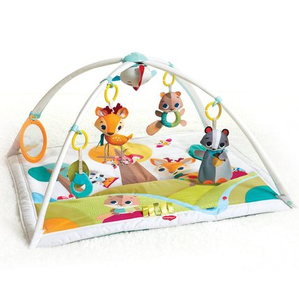 Baby awakening and activity mat. Comfortable play area, scalable usable from birth to 1 year. Theme: Forest. Equipped with adjustable, removable arches that adapt to the different stages of Baby's development. 3 Modes of use with or without the arches: Lying on your back on your stomach seated 7 Activities and games provided: 3 adjustable fabric figurines on the arches: Beaver. Raccoon. Fawn. 1 teething ring, mirror, fabrics, hide and seek game. Equipped with an arch connector and a removable touch sound and light electronic bird. Promotes the development of motor skills, visual and auditory senses, cognition and emotional intelligence.
