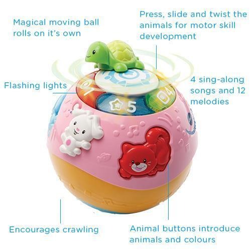 Catch the ball if you can! The Crawl & Learn Bright Lights Ball by Vtech features a fun built-in motor that activates to magically move the ball promoting crawling. The transparent colourful number buttons light up attracting baby and the spinning disk on top spins the cute turtle triggering fun responses. Press the chunky buttons to meet the dog, cat, bear and rabbit, learn numbers 1-5 and hear 4 songs sung by the animals and listen to 12 happy melodies. English speaking voice promotes recognition and accelerates learning.