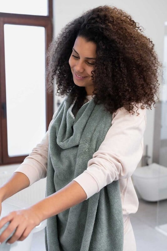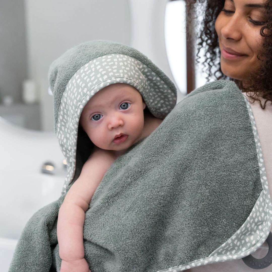 Doomoo's XL Bath Towel also serves as a bath apron for parents, protecting them from splashes. It has a hood and includes a ring/teether that keeps baby entertained while drying them, and also serves as a closure around the neck for parents to use during bath time. Thanks to the thickness of the organic cotton, this towel offers perfect absorption.