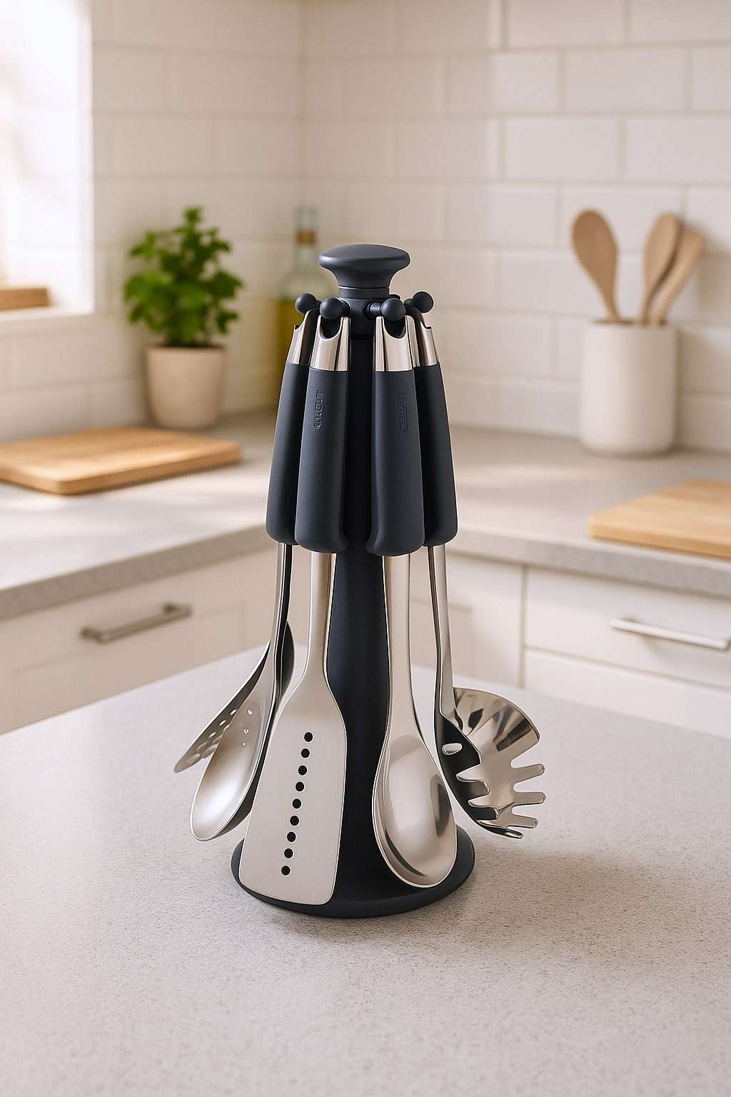 6-piece utensil set includes a solid spoon, slotted spoon, ladle, slotted turner, spaghetti server, skimmer, and a carousel storage stand