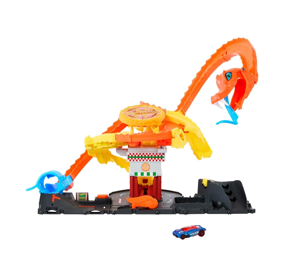 The Hot Wheels City Pizza Shop Cobra Takeover Playset challenges kids to save a pizza shop from a massive cobra that has taken it over.