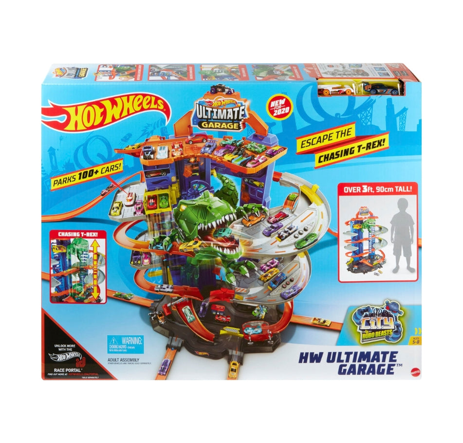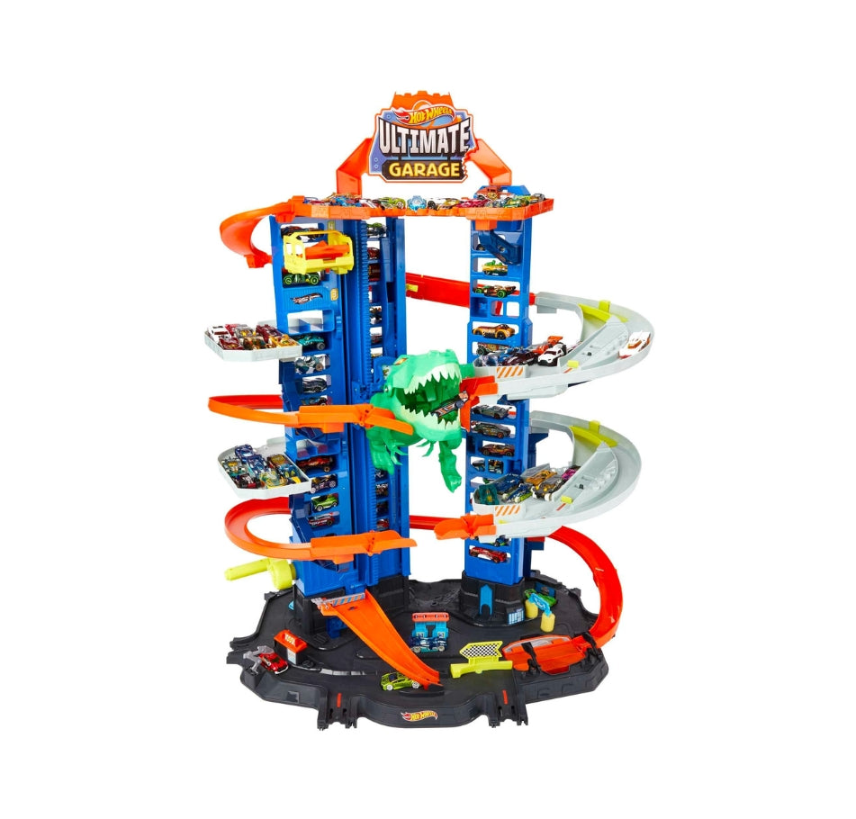 Calling all car enthusiasts! This colossal playset is every racer's dream, boasting parking for over 100 vehicles and a ferocious Robo-T-Rex for thrilling encounters.