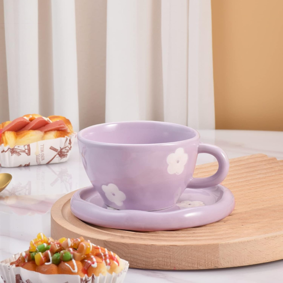 Irregular Hand-painted 250ml Flowers Ceramic Coffee Cup with Saucer