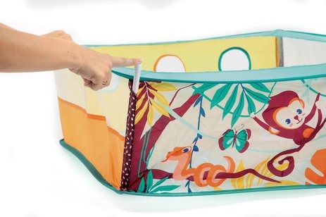 Ready in two easy steps - The ball pit with its pretty jungle theme, delimits a space for baby who can play with the 40 colorful balls and his favorite toys and pass the balls and his little hands through the 3 holes - Nomadic, this ball pit can be transported everywhere. Its pop-up structure and the 4 tubes, light and flexible, are very easy to install or fold. In the blink of an eye, you can easily store it in its carrying bag to enjoy holidays or weekends with the family with baby. At home, you can leave it folded and slide it behind a piece of furniture - Applied as an independent play area, the flexible structure will allow the "older ones" to get in and out easily. For toddlers who can crawl, we recommend parental supervision as the soft walls will not hold them in - Suitable for children over 6 months - Dimensions: 80 x 80 x 30 cm - Number of balls: 40 (6 cm diameter) - Easy to clean with a damp cloth.