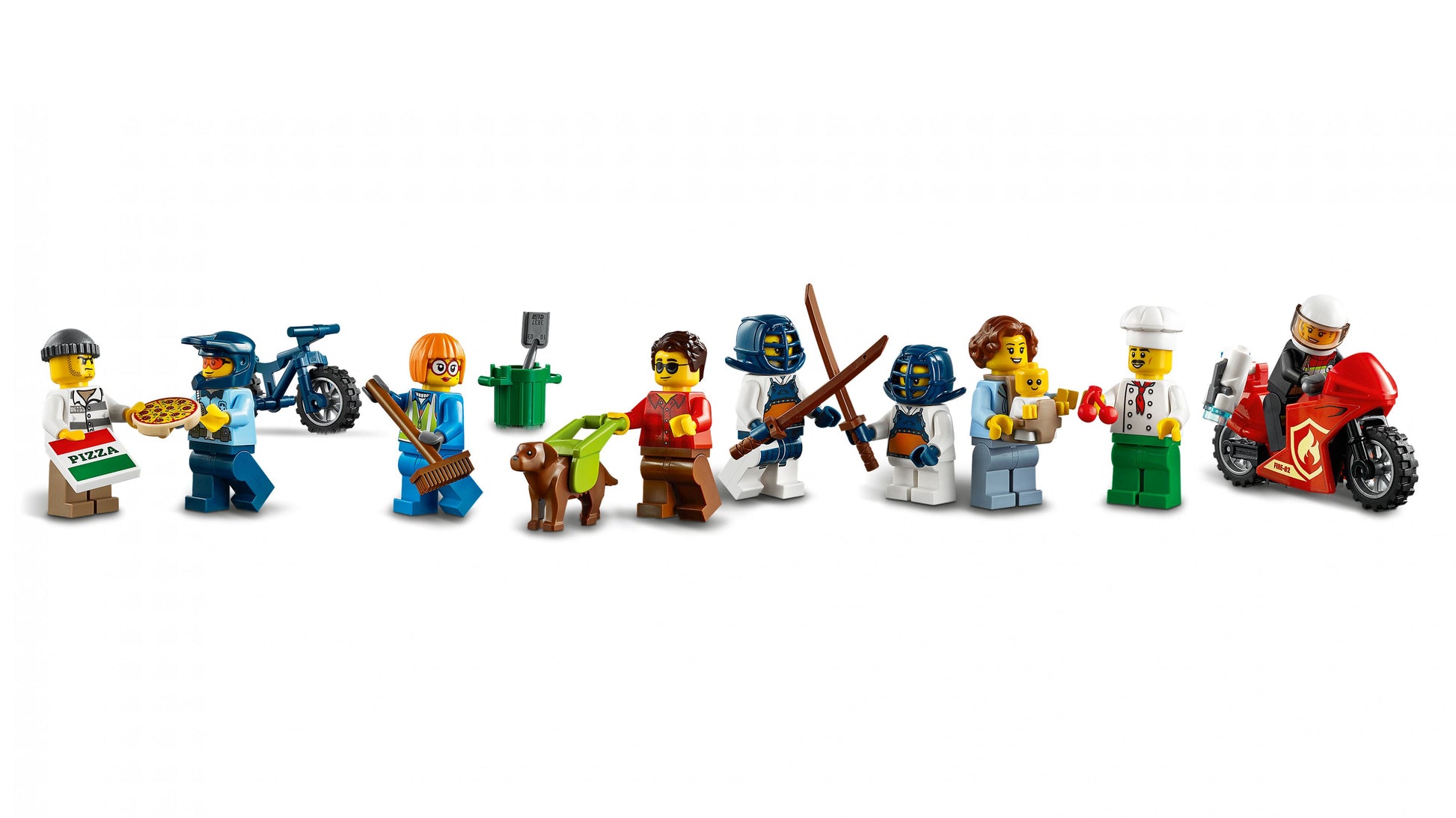 - 8 minifigures and baby and guide dog figures