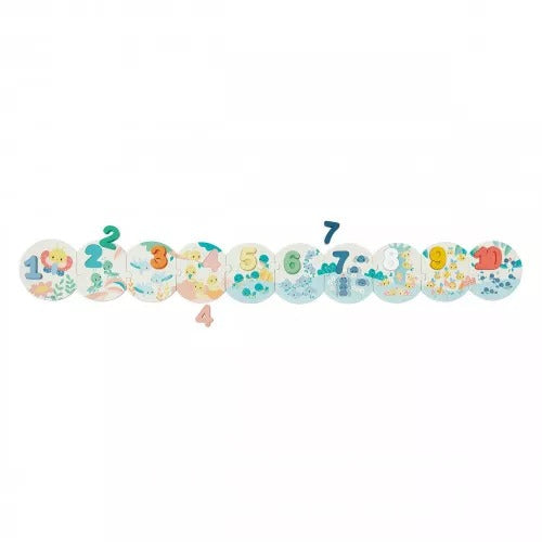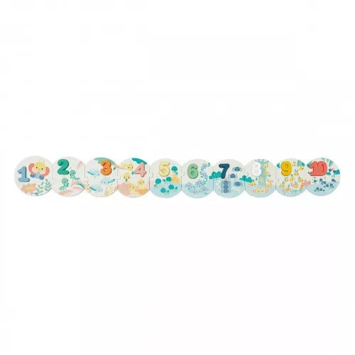 Watch little ones gradually learn to count with this magnificent cardboard puzzle, complete with colourful slot-in wooden numbers! The animals have been tasked to help make counting to 10 more fun for little ones aged 2 years and up. Once this pretty pastel-coloured 10-piece puzzle has been completed, the next activity is to place each number in the right position. There is of course a chronological order, but children will also be able to count the animals to determine the correct number for each piece. 3 dragonflies, 8 ladybirds... and so forth! A model is provided to help little ones whilst they are unfamiliar with the game. This learning puzzle is also ideal for developing fine motor skills. Once complete, it measures over a metre long! Practical: the numbers can be stored in a cotton pouch when playtime ends. Early-learning toy made from FSC® wood and cardboard.