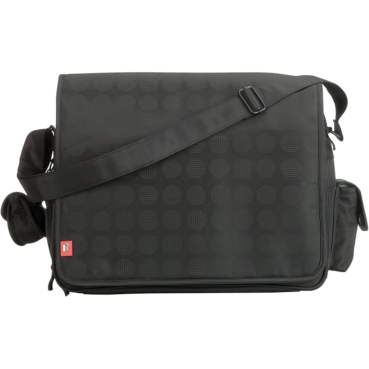 Practical diaper bag with built-in diaper pad, pacifier holder, thermos pocket, and many other pockets and compartments. The fabric is black with a discrete dotted pattern in the fabric.